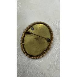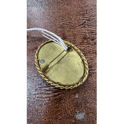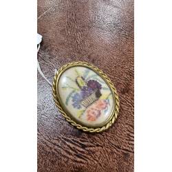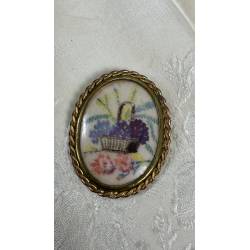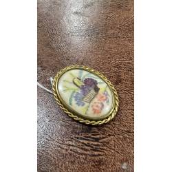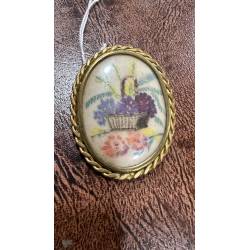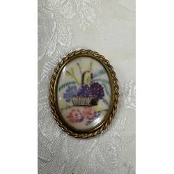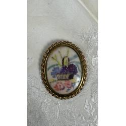 Antiguo broche decorado con un dibujo de una cesta de flores.