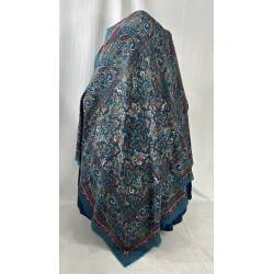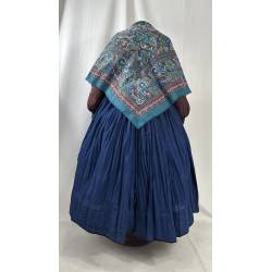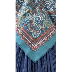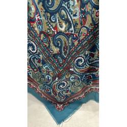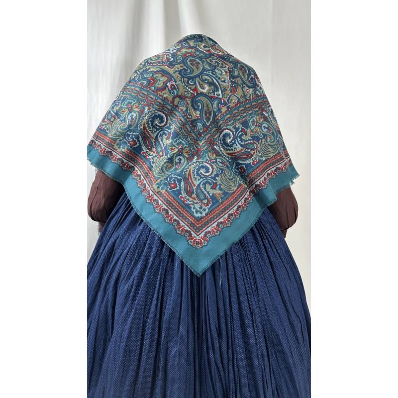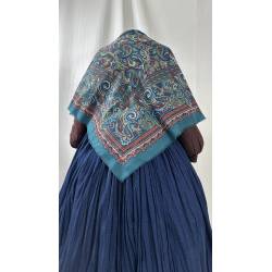 Antiguo pañuelo estampado, de lanilla sobre fondo azul.