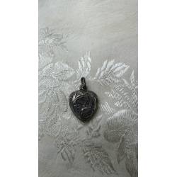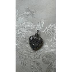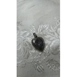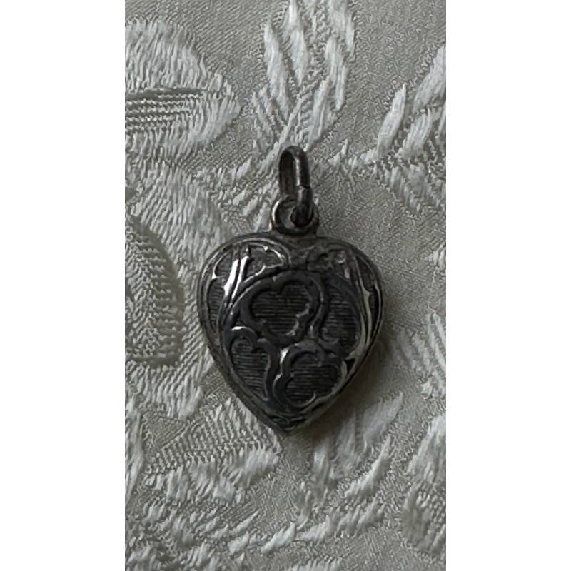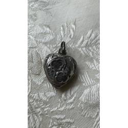 Antiguo colgante en forma de corazón, de color plateado y labrado.