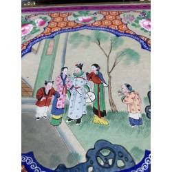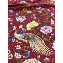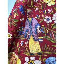Está bordado en el mismo tono en toda su totalidad. Además, gran parte del campo aparece pintado sobre el rojo en colores alegres.