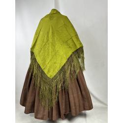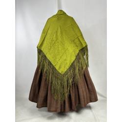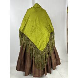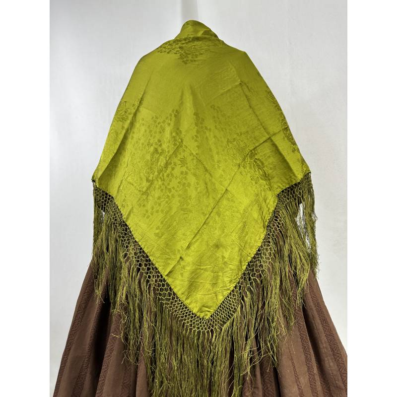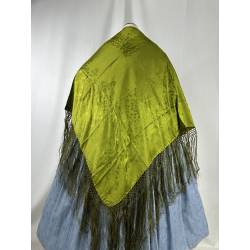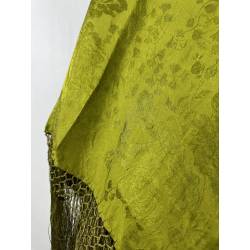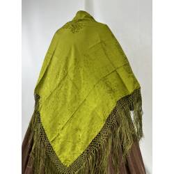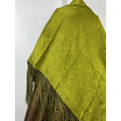 Pañuelo o mantón de seda pura, adamascado. De color aceite.